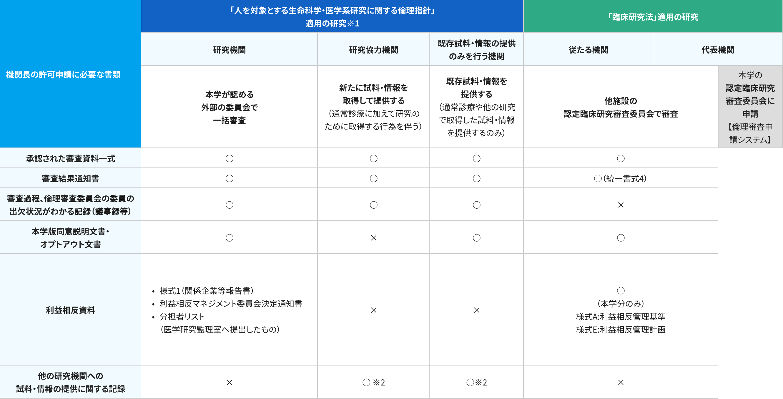 本学以外の倫理審査委員会や認定臨床研究審査委員会で審査された研究を実施する場合、あるいは、試料・情報の提供のみを行う場合は、機関長の許可を得る必要があります。